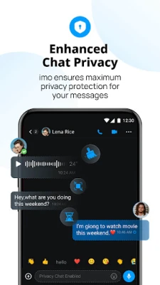 Vaša sigurnost i privatnost su naš najveći prioritet. imo primenjuje krajnju enkripciju (End-to-End Encryption) i napredne funkcije poput Time Machine, Poruka koje nestaju, Privatnog četa i Screen Shield-a, osiguravajući da vaši razgovori ostanu strogo poverljivi. Imate potpunu kontrolu nad svojim porukama – možete ih brisati, postavljati tajmere za nestajanje i sprečavati snimanje ekrana, kopiranje ili deljenje sadržaja. Za dodatnu zabavu i povezivanje, pridružite se imo VoiceClub-u, mestu gde možete kreirati ili se priključiti sobama za razgovor, slušati muziku i organizovati različite događaje, od talent šou programa do takmičenja, deleći radost sa voljenima.